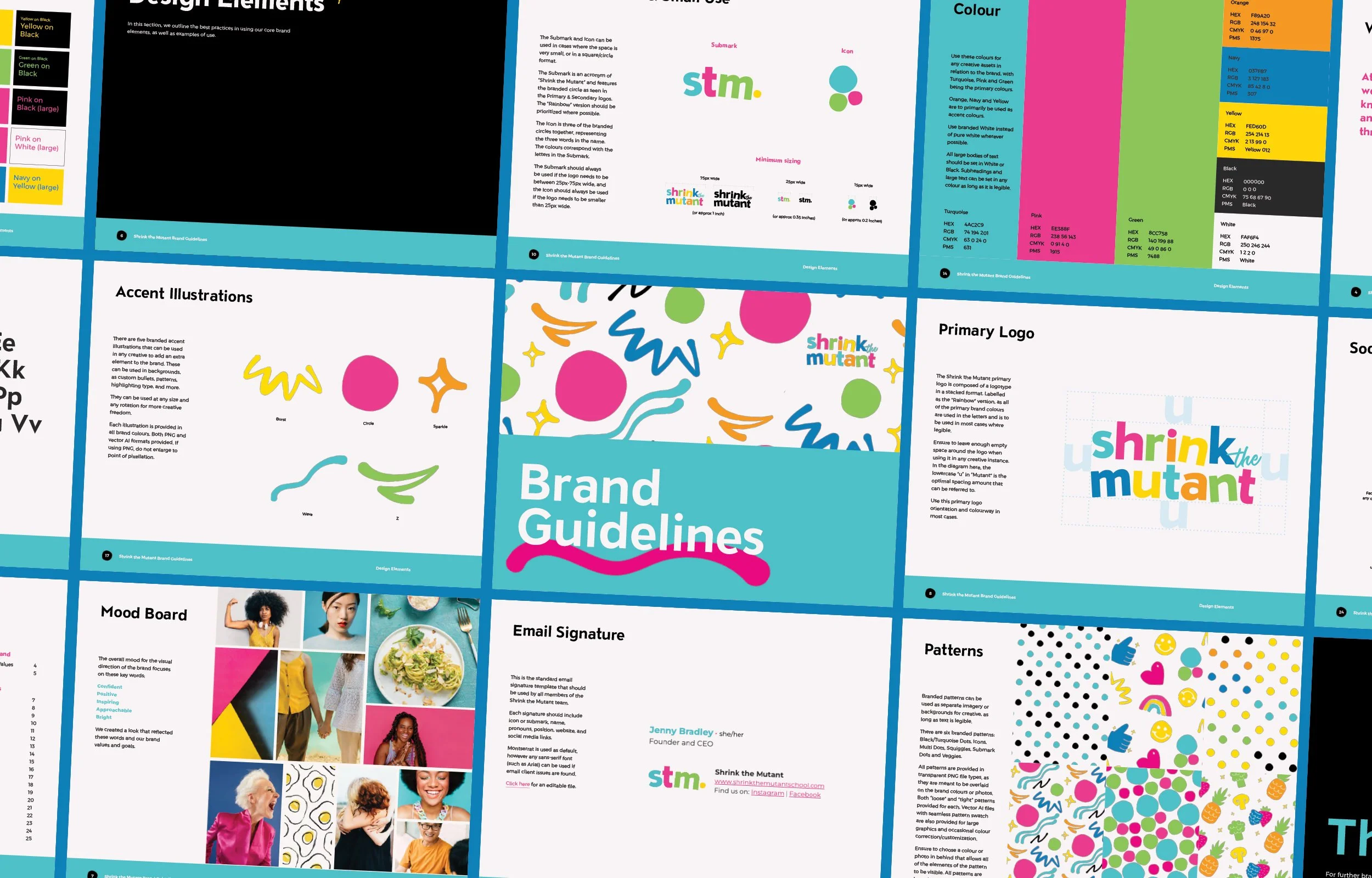Shrink the Mutant is a business that provides valuable, research-based resources and coaching to people with cancer, or those who know people with cancer and need support. The founder, Jenny Bradley, wanted the brand to reflect her fun, positive nature and not look like a typical business associated with cancer. Before working together, she found that her brand wasn’t cohesive, felt messy, and she wasn’t in love with how it looked or how it represented her and Shrink the Mutant. I created a brand that is more versatile, plus is fun and cheerful like Jenny!