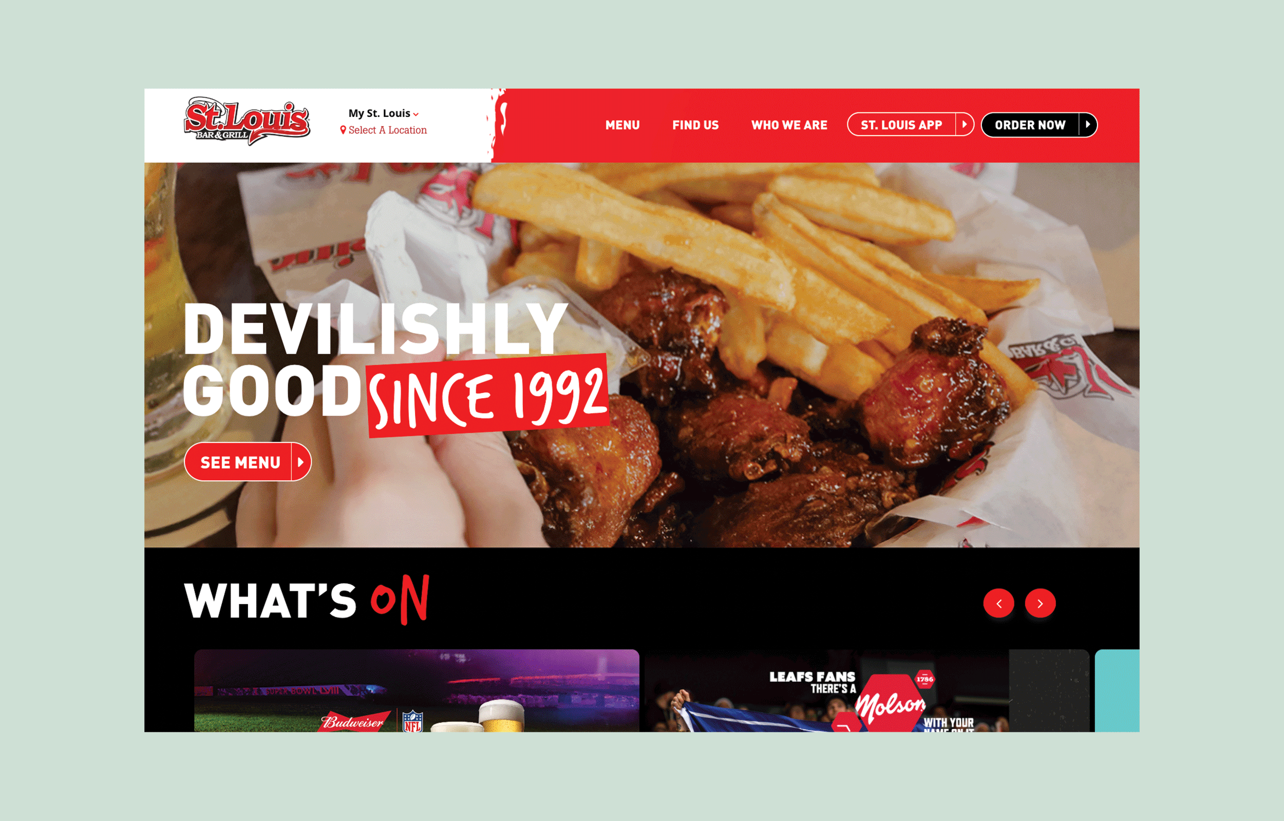 St. Louis Bar & Grill is a fast casual restaurant chain in Canada. I was tasked to redesign their website so it better reflected their fun, bold, Devilishly Good brand, and provide an overall refresh to their outdated site. I started the project with strategy research including competitor analysis, working closely with the St. Louis team to create the fresh new look with their existing brand elements.